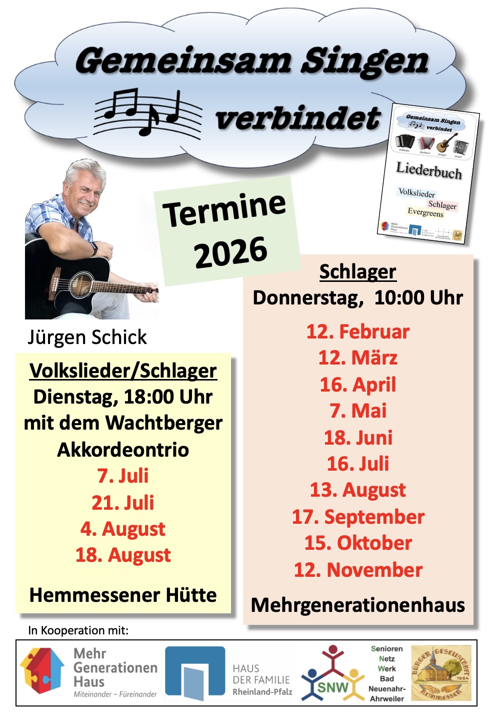 Donnerstag 7. November 2025 – 13:00 Uhr „Deutsche Schlager“ mit Texten zum mitsingen im Rahmen der Veranstaltung „Gesund älter werden“ im Mehrgenerationenhaus in Bad Neuenahr |